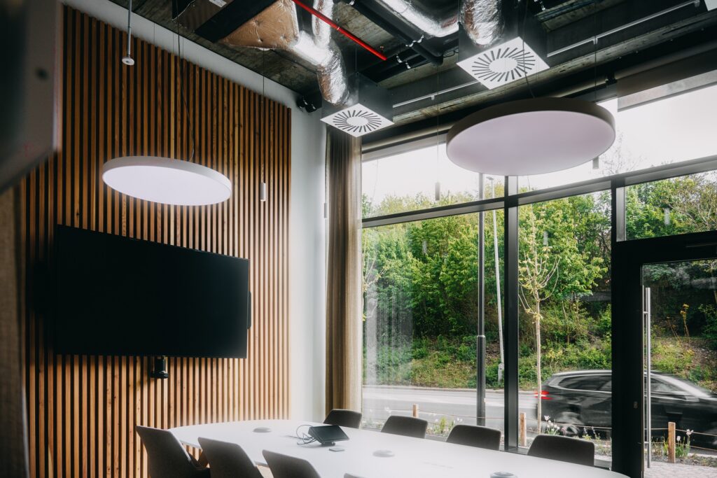 Veolia Energie ČR, a.s.: Meeting rooms in the administrative building Penta Real Estate Legatica Nová Waltrovka equipped with designer pro-cognitive direct-indirect circular lighting suspended above the conference table Translated using AI