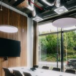 Veolia Offices in Prague’s Florentinum: Linear indirect luminaires create the impression of natural overhead light throughout all areas of the Veolia Energy headquarters. The image shows a meeting room in the central part of the space without access to natural daylight. Spectrometer measurements indicate a spectral composition that is almost identical to natural sunlight in the visible range. This is indispensable in windowless rooms. Translated using AI