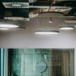 Veolia Energie ČR, a.s.: Detail of an unusually designed ceiling with exposed technical conduits complemented by direct and indirect lighting designer circular luminaires Spectrasol Sunround Translated using AI