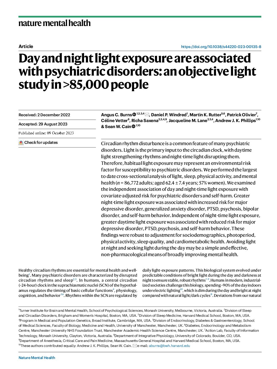 Inappropriate light is associated with mental disorders, confirmed by a large-scale study of light, sleep, physical activity, and mental health in more than 85,000 people. Circadian rhythm disruptions are behind many psychiatric disorders. Exposure to inappropriate light therefore represents an environmental risk factor for susceptibility to psychiatric disorders. Seeking light during the day and avoiding light at night can be a simple and effective non-pharmacological means to overall improve mental health.