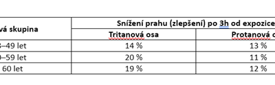 - Improvement in contrast sensitivity approximately 17% for the blue-yellow axis (tritan) and about 12% for the red-green axis (protan) after 3 hours post-exposure. When the population was divided by age, the improvement was up to 20% for tritan and 13% for protan, as shown in the following table.