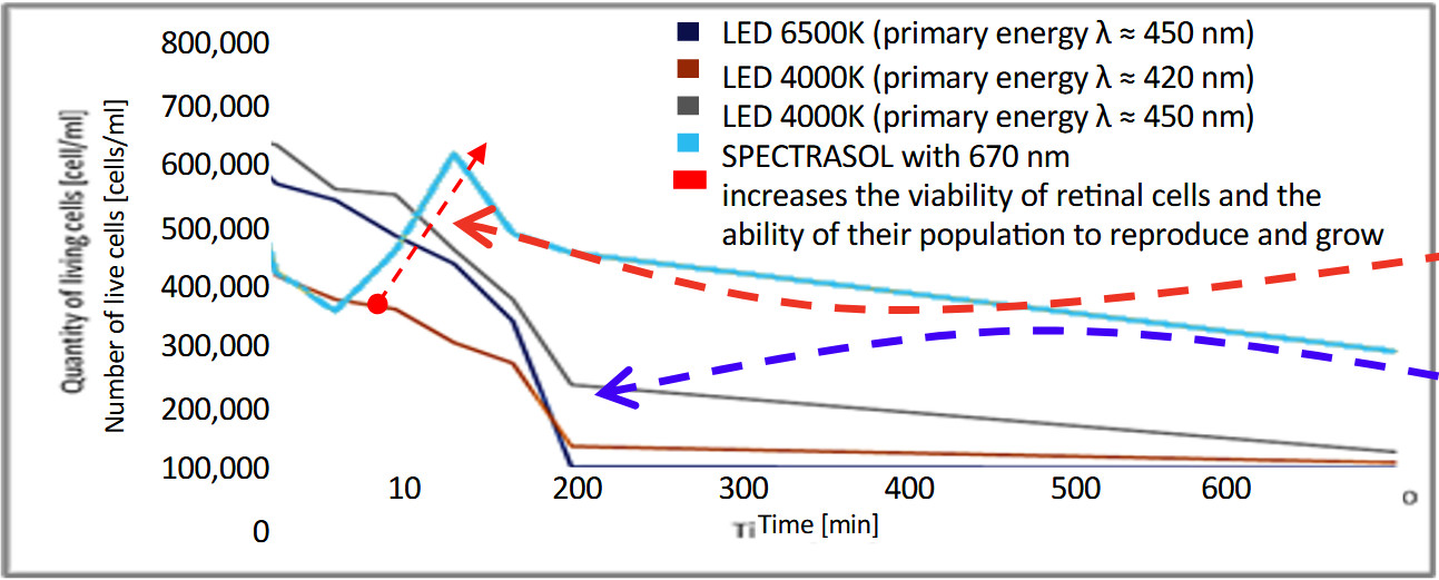The graph shows how the number of living retinal cells changes over time when illuminated by different types of LEDs.