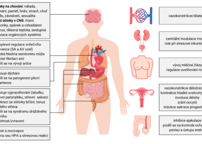 Serotonin, nicknamed the “happiness hormone,” is a very important neurotransmitter that transmits impulses not only in the central nervous system but also plays a key role at the periphery. It is most well-known for regulating mood, anxiety, and depression, appetite, and sleep; essentially, itâs involved in practically all human behavioral processes. Its production is not limited to neurons; more than 90% of serotonin is produced in the intestines by enterochromaffin (EC) cells, whose production is significantly influenced by our gut microbiome. Serotonin thus also affects gut motility, modulates immunity and inflammatory processes in the gut, and influences nutrient absorption. Its effects are far-reaching (see Fig. 1) because it binds to serotonin receptors, which are found throughout the body.