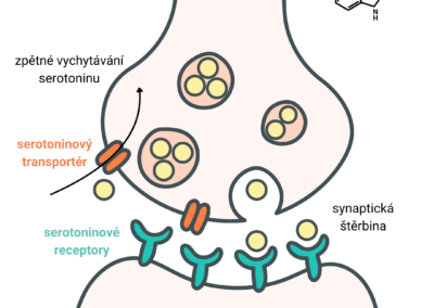 Picture 3: Schematic representation of neural connection. Serotonin is a neurotransmitter that is released from synaptic vesicles from the pre-synaptic neuron into the synaptic cleft, where it can bind to serotonin receptors on the post-synaptic neuron, transmitting the signal to the next neuron. Serotonin transporters ensure the reuptake of serotonin from the synaptic cleft, ensuring its recycling.