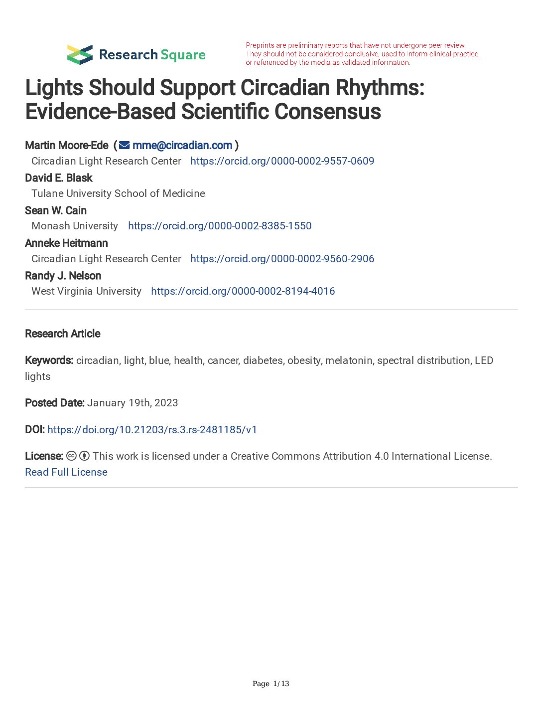 For over a hundred years, the lighting industry has primarily been driven by illumination aesthetics, energy efficiency and product cost with little consideration of the effects of light on health. The recent widespread replacement of traditional light sources by blue-enriched LED lights has heightened concerns about the disruption of the blue-sensitive human circadian system by these LED lights and their impact on the multiple health disorders linked to circadian disruption. Despite these health concerns, less than 0.5% of the lighting sold today modifies spectral content and intensity between day and night. We report that 248 scientists, with a total of 2,697 peer-reviewed publications on light and circadian clocks since 2008, reached consensus on 24 statements about the impact of light on circadian rhythms and health based on accumulated scientific evidence, including support for the widespread introduction of circadian lighting and warning labels on blue-enriched LED lights indicating that they âmaybe harmful if used at nightâ