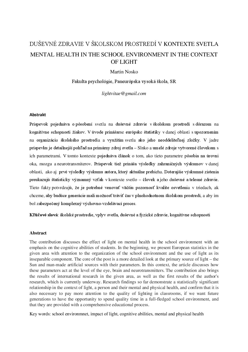 The study discusses the impact of light on mental health in the school environment, with an emphasis on students’ cognitive abilities. In the conducted experiment, Spectrasol procognitive lights were used. The initial results in December 2022 showed that students in classrooms with long-term installed full-spectrum procognitive lighting achieved better results in all used research methods. The most significant difference was demonstrated in a test focused on reaction time. In the group with regular lighting, only about 30% of students completed this test, while in the group with procognitive lights, it was up to 83% of students.