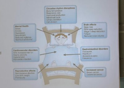 At the beginning of the conference, it was mentioned that, compared to our ancestors, we are capable of functioning 24/7, which is partly related to the overuse of electric light. Its unnatural properties expose us to significant challenges regarding its effects on the body, health, and life. It was also repeatedly emphasized that the spectral composition of light is crucial in its biological effects. You can familiarize yourself with the health problems caused by poor circadian rhythm functioning through the table from one of the presentations below.