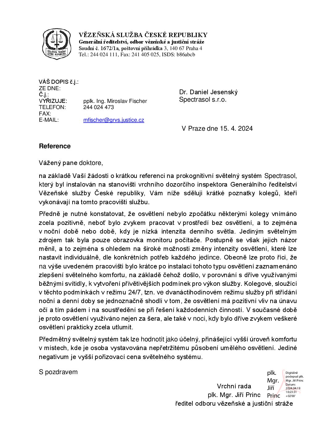 âWe especially see the benefits during night shifts, when it is possible to regulate the lighting intensity and eliminate glare and the unwanted effects of direct light on the workspace,â describes Senior Advisor Colonel JiÅÃ Princ, Director of the Prison and Judicial Guard Department.