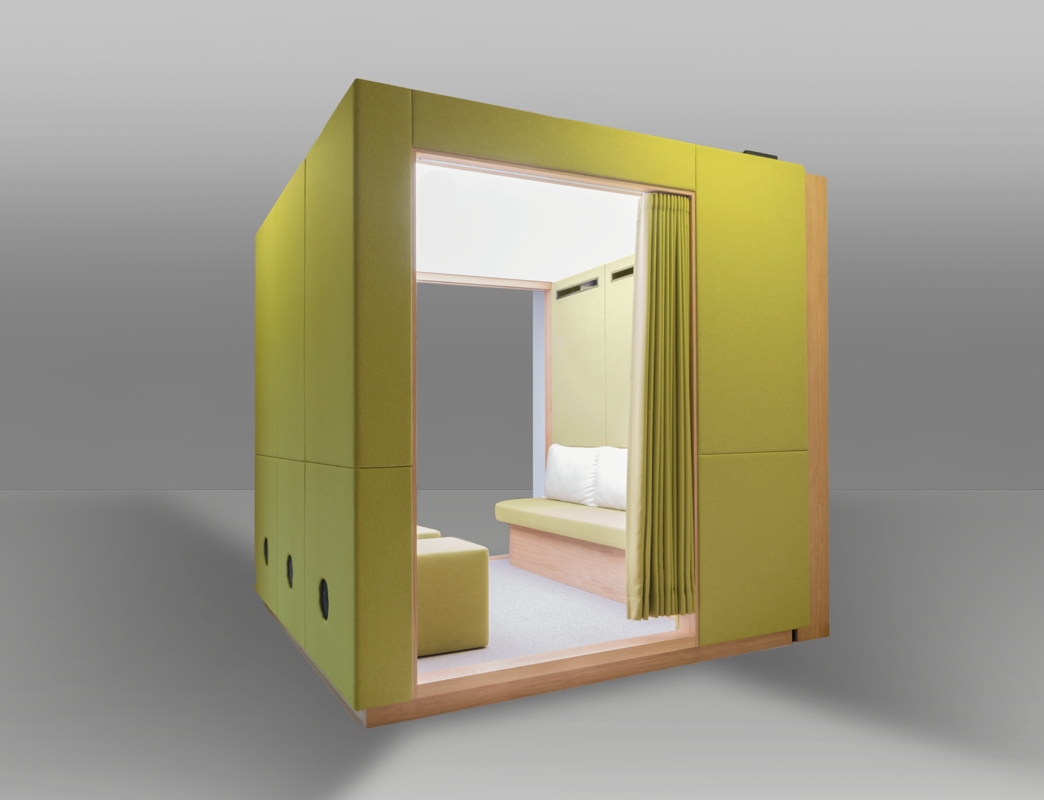 The pavilion is a large-scale phototherapy device for the treatment and support of psychological states and stabilisation of circadian rhythms. It is a standalone cube-shaped structure with a side of approximately 2.5 metres, which can be placed in a hall, waiting room in a mental health centre or similar institution providing inpatient and outpatient care. Inside there is a space offering comfortable seating for up to 6 people.