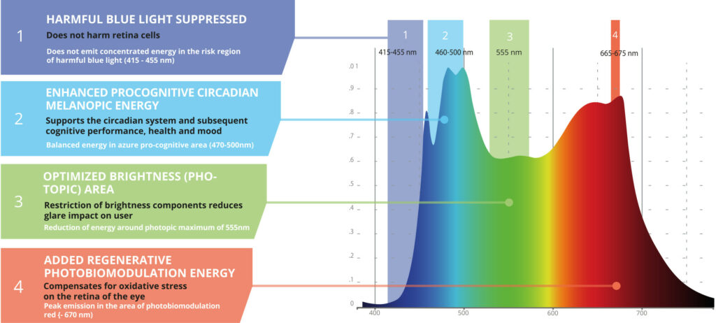 The high therapeutic effectiveness is made possible by the use of the unique Spectrasol Therapeutic light spectral composition technology (protected by Patent No. 308363) with a high representation of wavelengths in the photosensitivity range of the ipRGC cells, which act on the circadian system. At the same time, the spectral distribution is favourable to usersâ eyes by limiting harmful blue wavelengths below 450 nm and encompassing red wavelengths of around 670 nm.