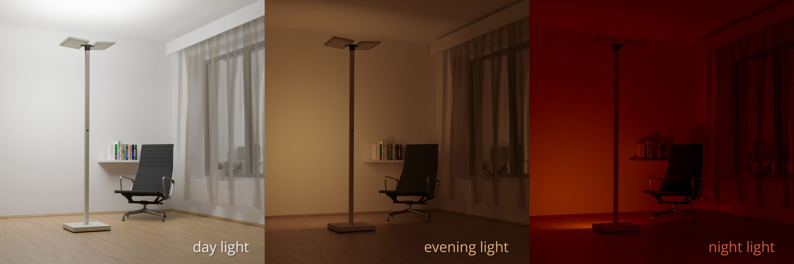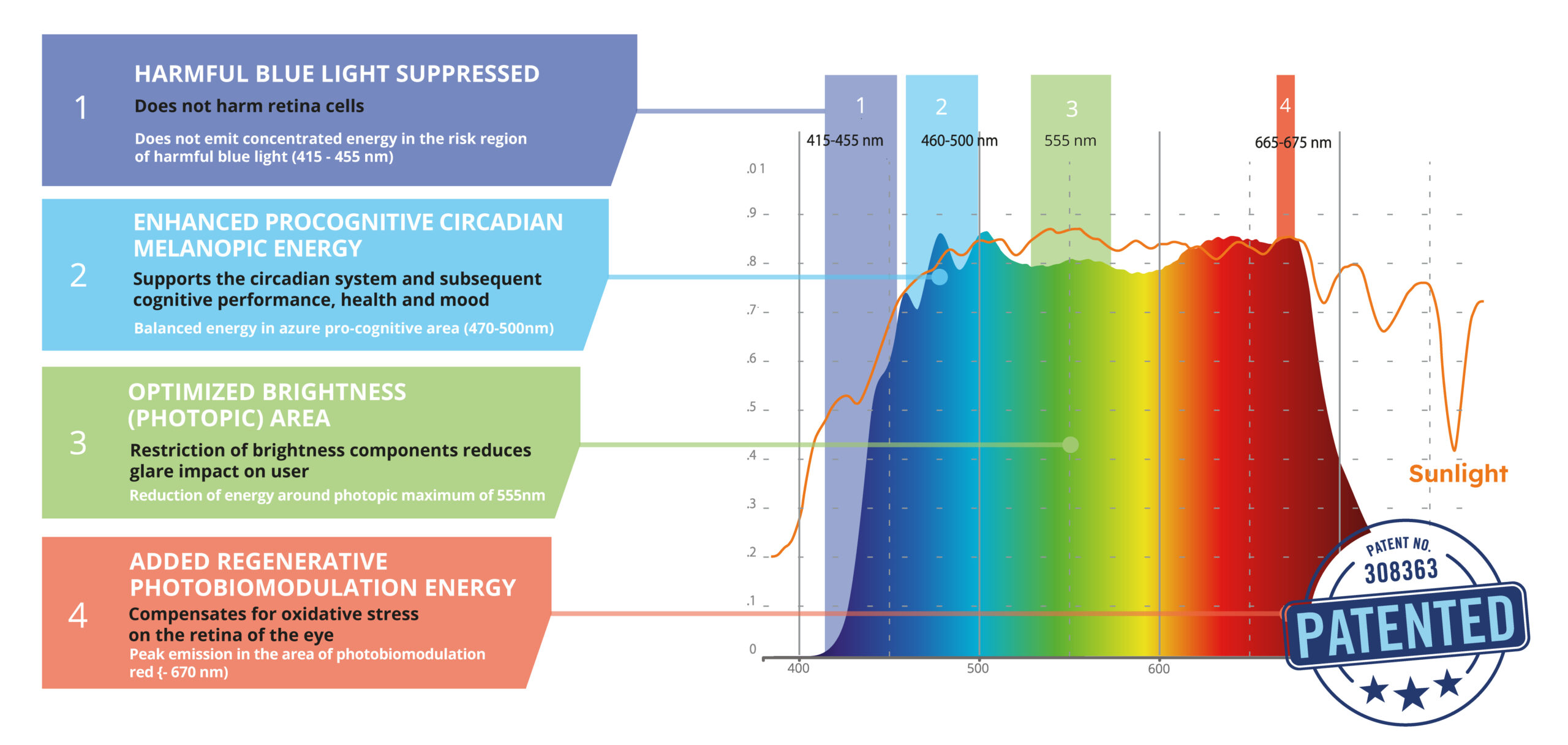 The light modes are automatically controlled in accordance with the 24-hour light cycle in nature and effectively affect the non-image forming (NIF) system of the eye.