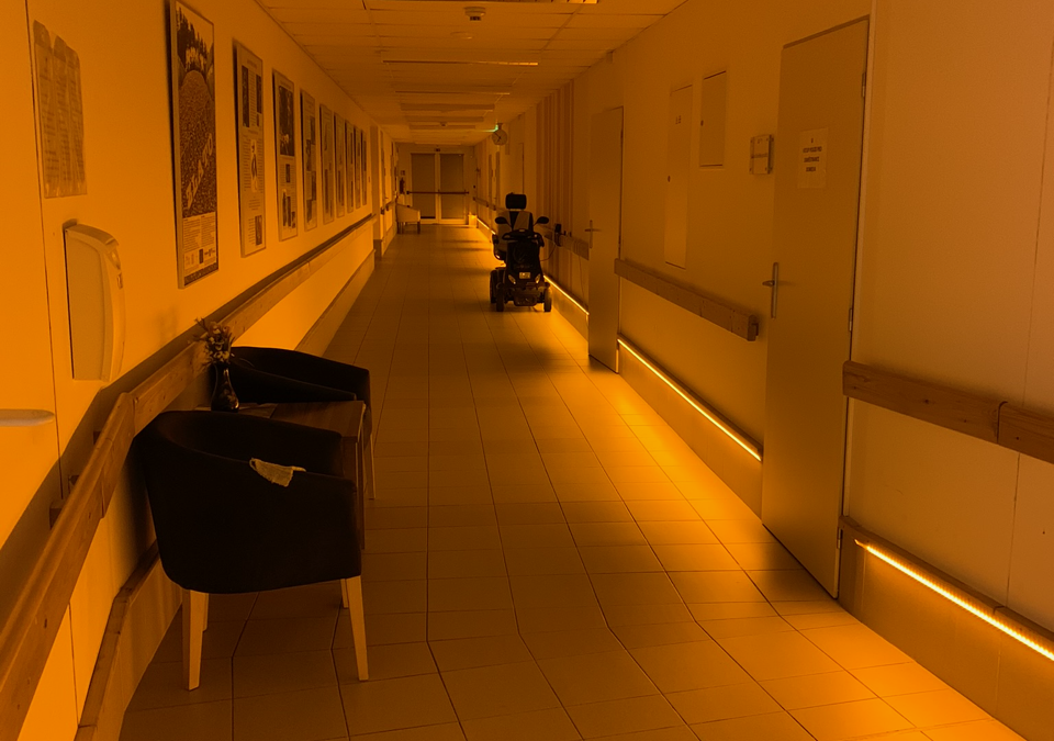 Night lighting in the corridor of the home installed at a level above the ground so as not to dazzle the clients. Moving around the corridor at night is pleasant, safe and does not disturb circadian rhythms.