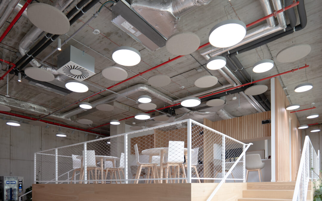 The design solution for pro-cognitive circular lighting can handle high ceilings with exposed technical installations.