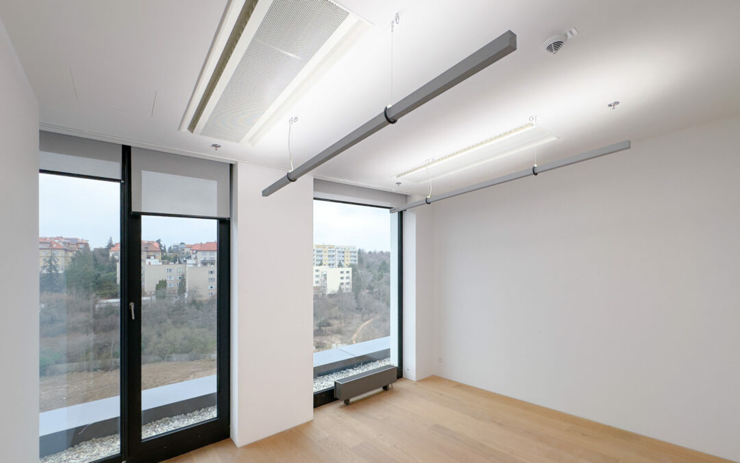 Individual Variability: The installation of linear indirect luminaires into a special suspended tilting system in the Legatica Nová Waltrovka building allows for individual adjustment of the luminaire angle according to each user’s preferences and the layout of a specific office. Indirectly distributed light mimics natural light in nature.