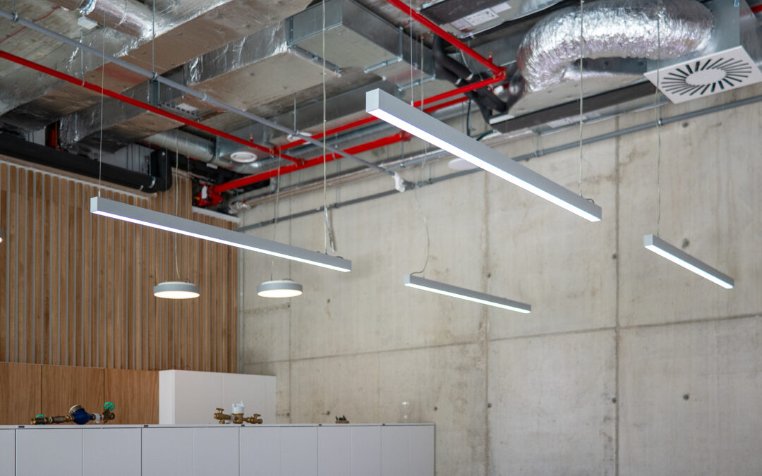 The Sunline Direct linear direct luminaires match well with the unconventional concept of the ceiling in the offices of the Legatica Nová Waltrovka building.