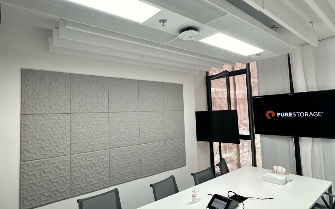Playing with design: Pure Storage’s meeting room and the natural incorporation of embedded lights into a non-typical ceiling.