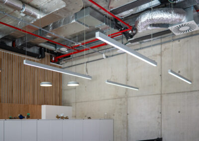 - Veolia Spectrasol Sunline45 linear pendant luminaires with indirect light distribution through light bounced off the ceiling, SunRound circular direct luminaires and SunlineDirect linear direct and indirect luminaires