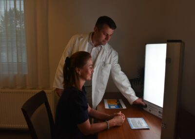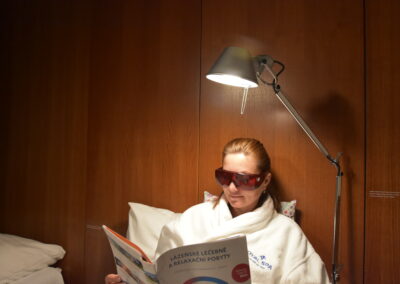 Applied phototherapy equipment helps in the treatment of affective disorders such as seasonal depression. The stay is supervised by a specialised therapist. At the beginning of the stay, visitors undergo an initial medical examination and subsequently undergo phototherapy with full-spectrum pro-cognitive lighting. The stay includes physical activities, aqua fitness and relaxation treatments with unlimited access to the wellness and sauna world and more. The effects of the stay on sleep are continuously evaluated by diagnostic sensors integrated in the beds.