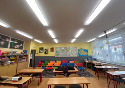 The implementation significantly improved the quality of the lighting environment in the school. The new LED pro-cognitive lighting, with properties close to natural daylight, positively affects concentration, increases visual comfort, and contributes to a more pleasant overall classroom atmosphere.