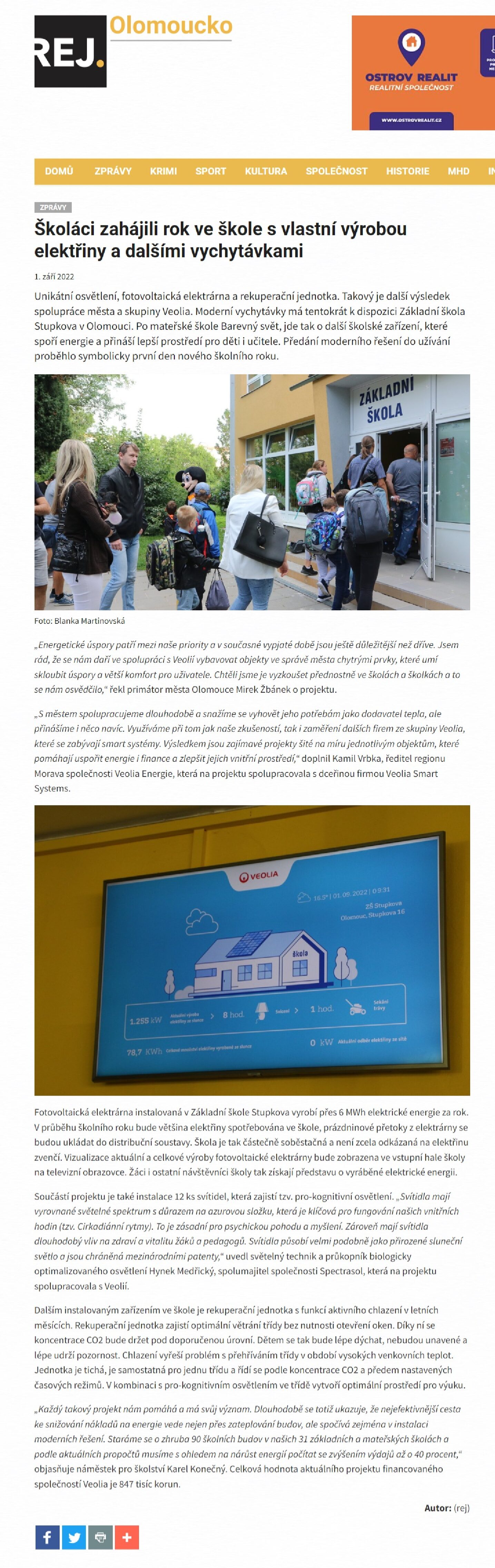 Spectrasol’s unique lighting, a photovoltaic power plant, and a recovery unit. This is the latest result of the cooperation between the city and the Veolia group. This time, the modern gadgets are available at Stupkova Elementary School in Olomouc. Following the kindergarten Barevný svět, it is another educational facility that saves energy and provides a better environment for children and teachers. The handover of the modern solution for use took place symbolically on the first day of the new school year.