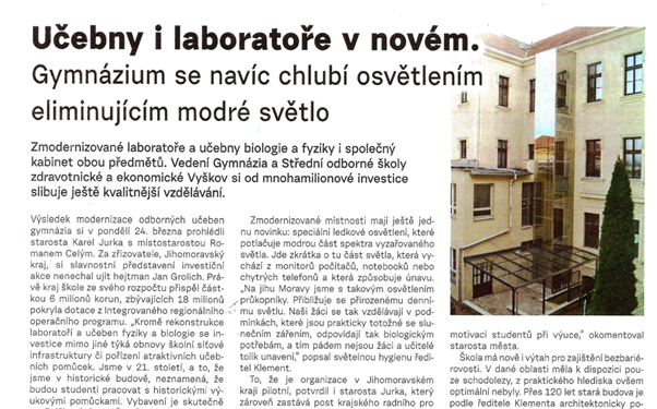 In 2024, the Grammar School and Secondary Medical and Economic School Vyškov underwent partial renovations, which included the modernization of lighting in selected classrooms. The school’s principal, RNDr. Václav Klement, focused on the highest quality – not only in terms of energy efficiency, but also emphasizing the biological and cognitive effects of light.